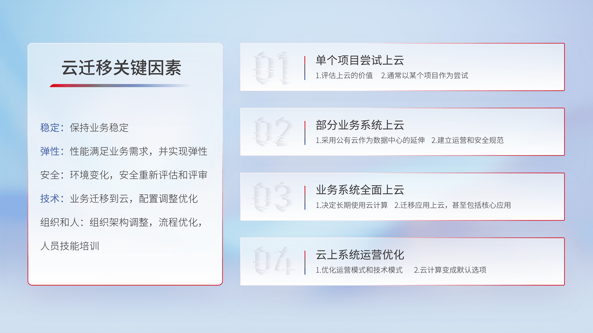 结合实际业务,,从规划设计、、、云平台选型、、云原生改造、、数据迁移、、、、集成交付,,,迁移全过程为客户识别最佳上云路径,,,做好风险识别管理,,,,设计网络架构、、身份权限、、安全审计合规、、、、操作审计、、、日志审计、、、监控告警策略、、、、多站点容灾设计等,,,,对云上基础设施进行整体规划,,,,提升IT治理水平,,,以满足弹性、、、高可用、、、、高性能的需求。。。