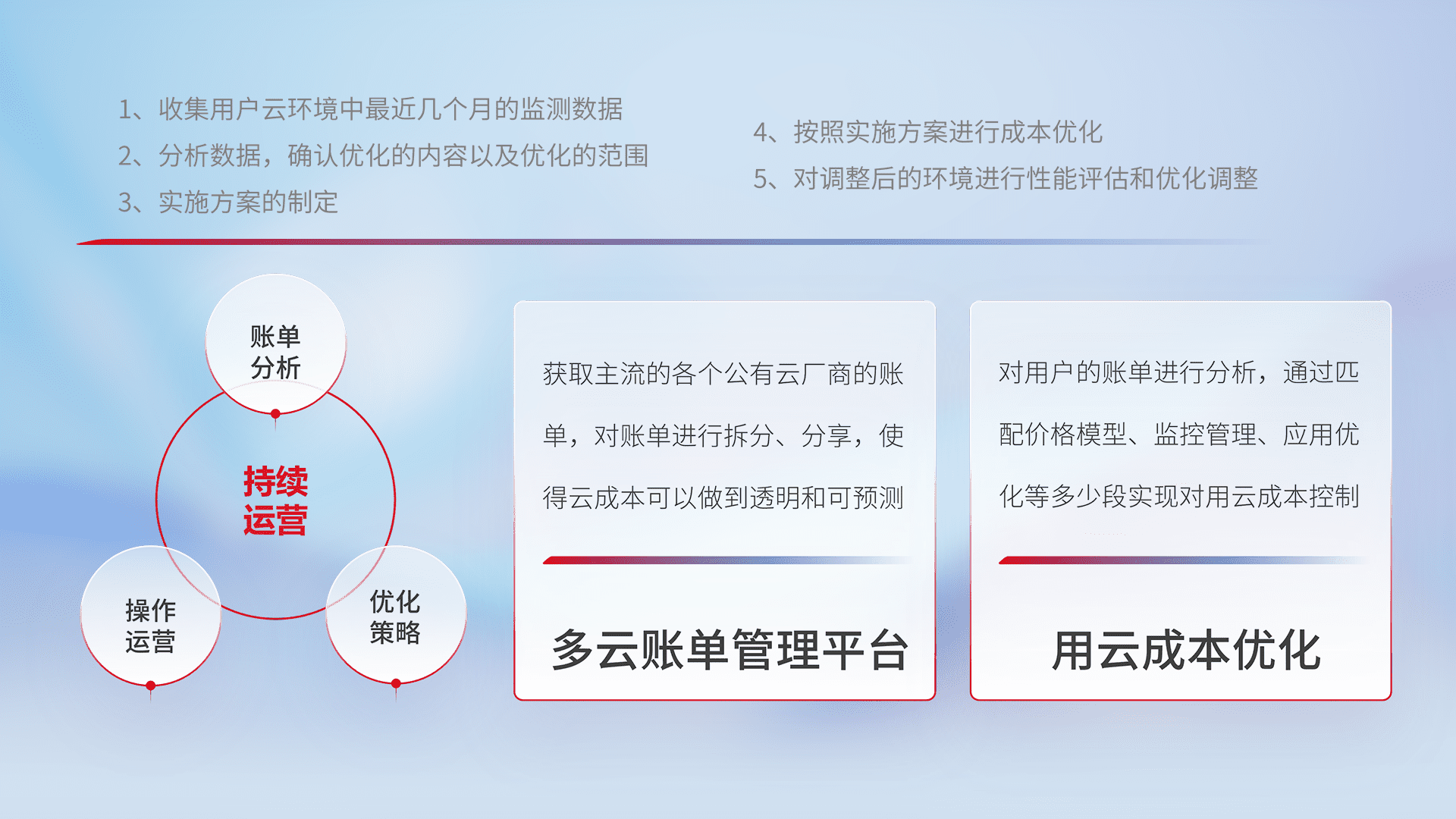 通过多云纳管,,以统一的资源数据模型把客户的云资源进行抽象和封装,,,,进而实现对多云资源的统一操作,,,保障云资源管理的可靠性、、稳定性与可用性。。量身定制化运维内容,,配置、、、、开发运维、、补丁管理、、备份、、、、监控、、、认证和访问管理、、、审计和日常巡检等,,,,保障在用云过程中的可靠度,,,稳定度以及高可用率。。。